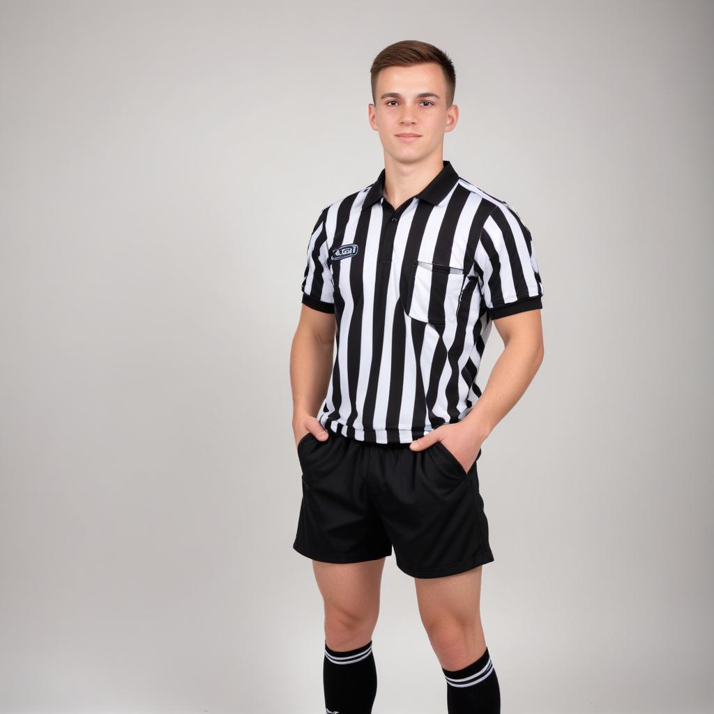 background, black, casual, gray, hands, look, man, official, person, pocket, portrait, referee, shirt, shorts, sports, standing, striped, studio, uniform, white