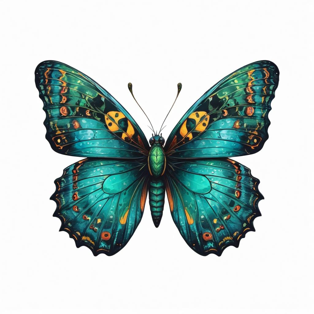A teal butterfly with yellow markings on its wings is shown in a detailed illustration.