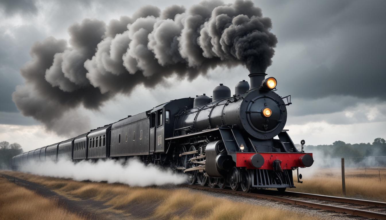 A black steam locomotive with a large plume of smoke billowing from its chimney pulls a train through a rural landscape