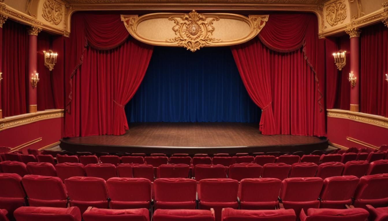 A theater stage with red velvet curtains is set for a performance, with empty red seats facing the stage.