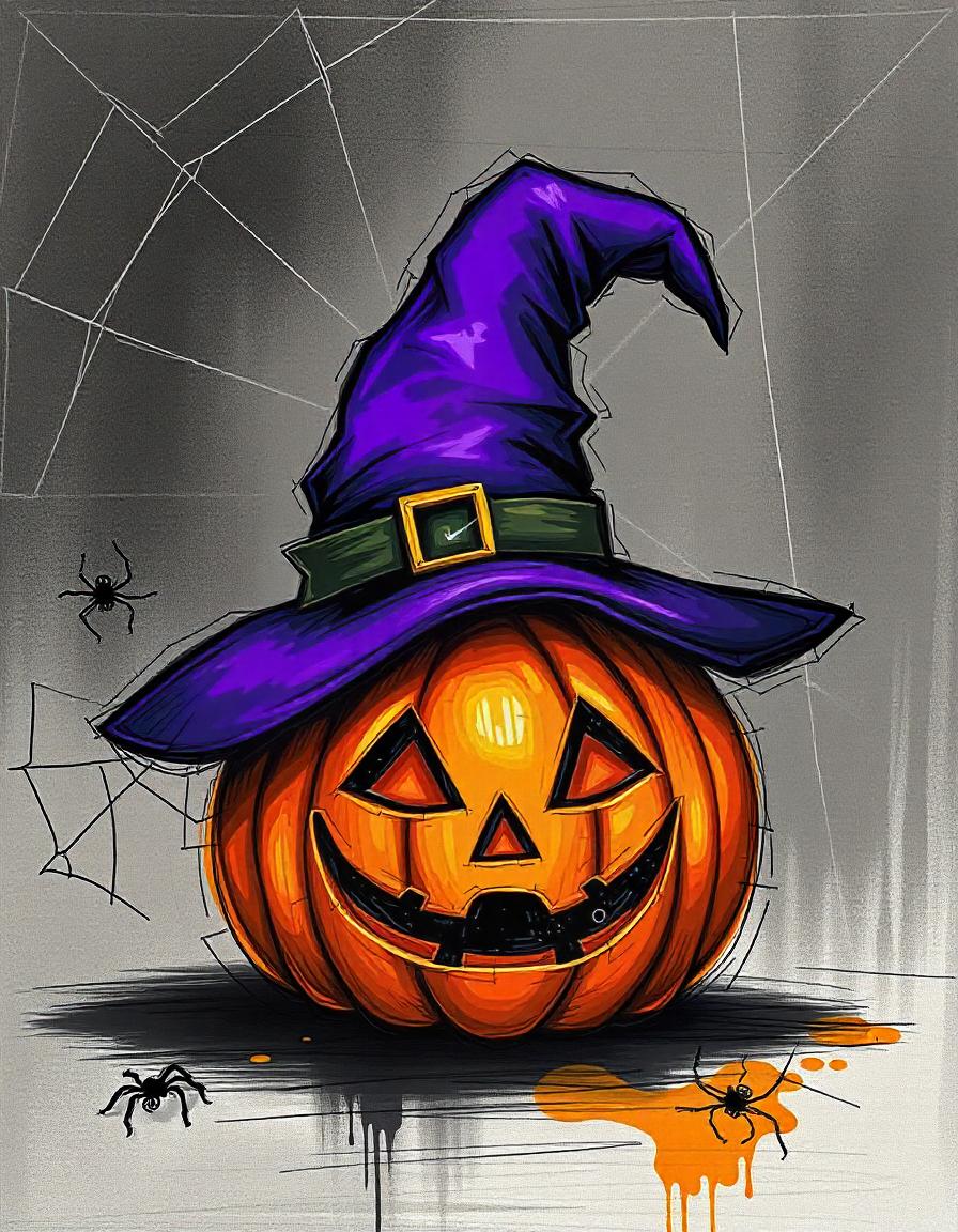 black, carved, celebration, digital, drips, festive, halloween, hat, holiday, illustration, october, orange, pumpkin, scary, smile, spider, spooky, table, white, witch