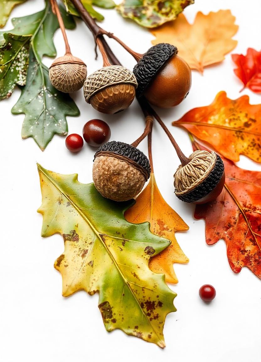 Acorns and colorful leaves are arranged on a white background. There are four acorns and three leaves, one green, one yellow and one red.