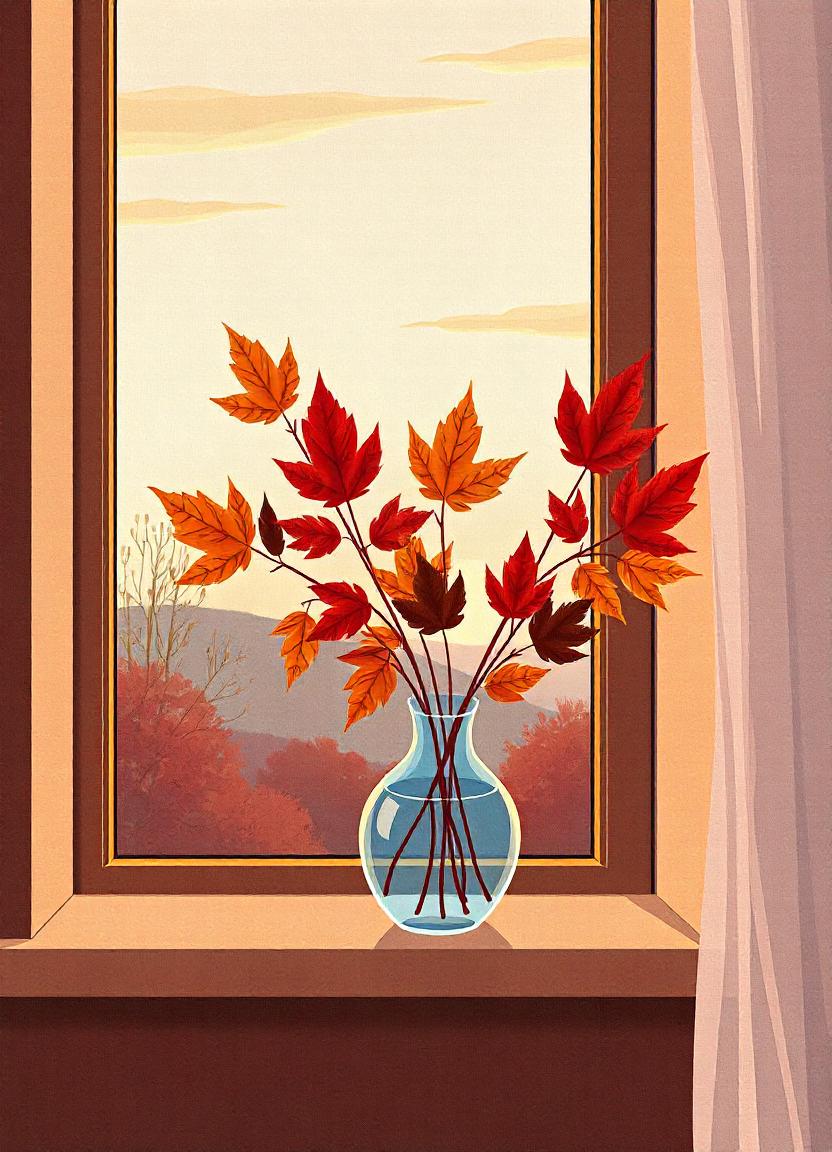 Autumn leaves in a vase on a windowsill