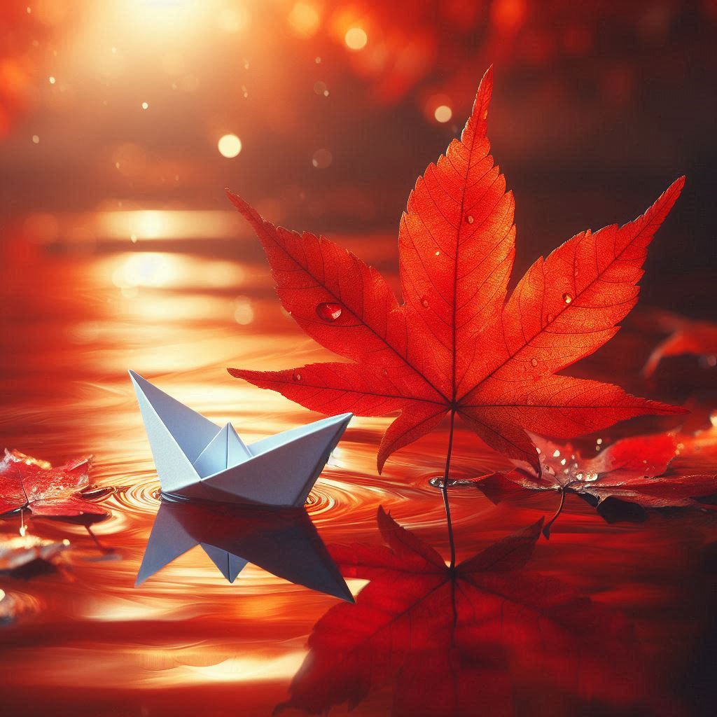 autumn, boat, brown, droplets, fall, floating, foliage, leaf, maple, nature, orange, outdoors, paper, puddle, red, reflection, season, surface, water, yellow