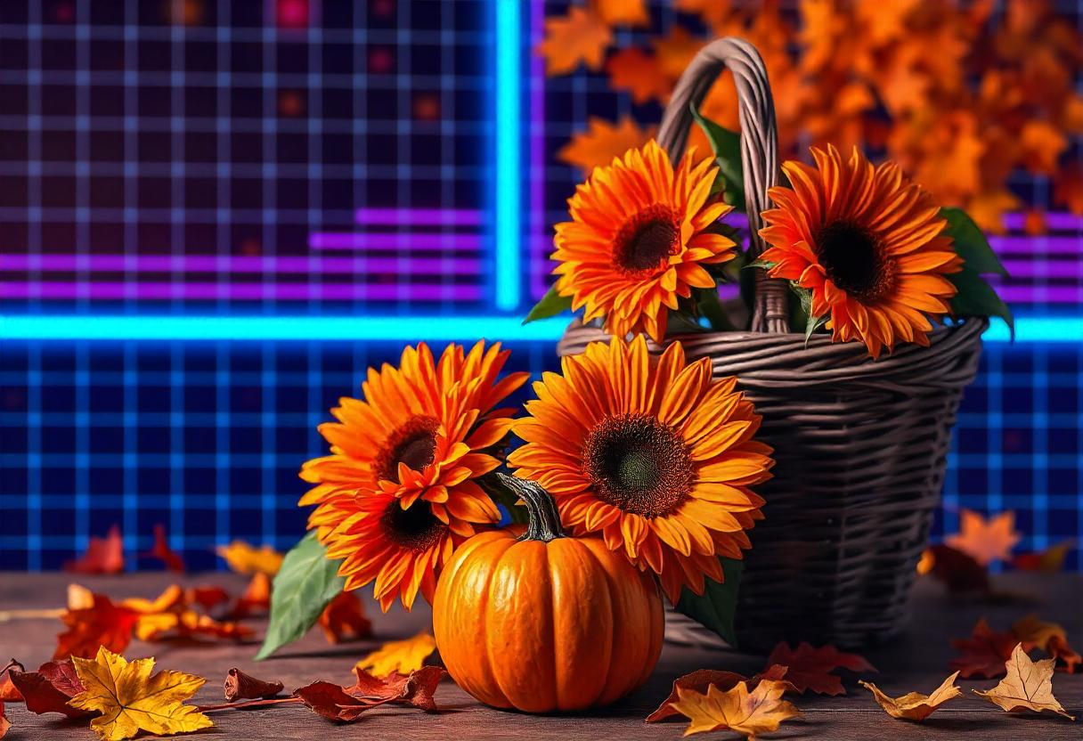 autumn, background, basket, blue, brown, fall, glowing, grid, leaves, line, nature, orange, pumpkin, purple, season, sunflowers, table, wicker, wooden, yellow
