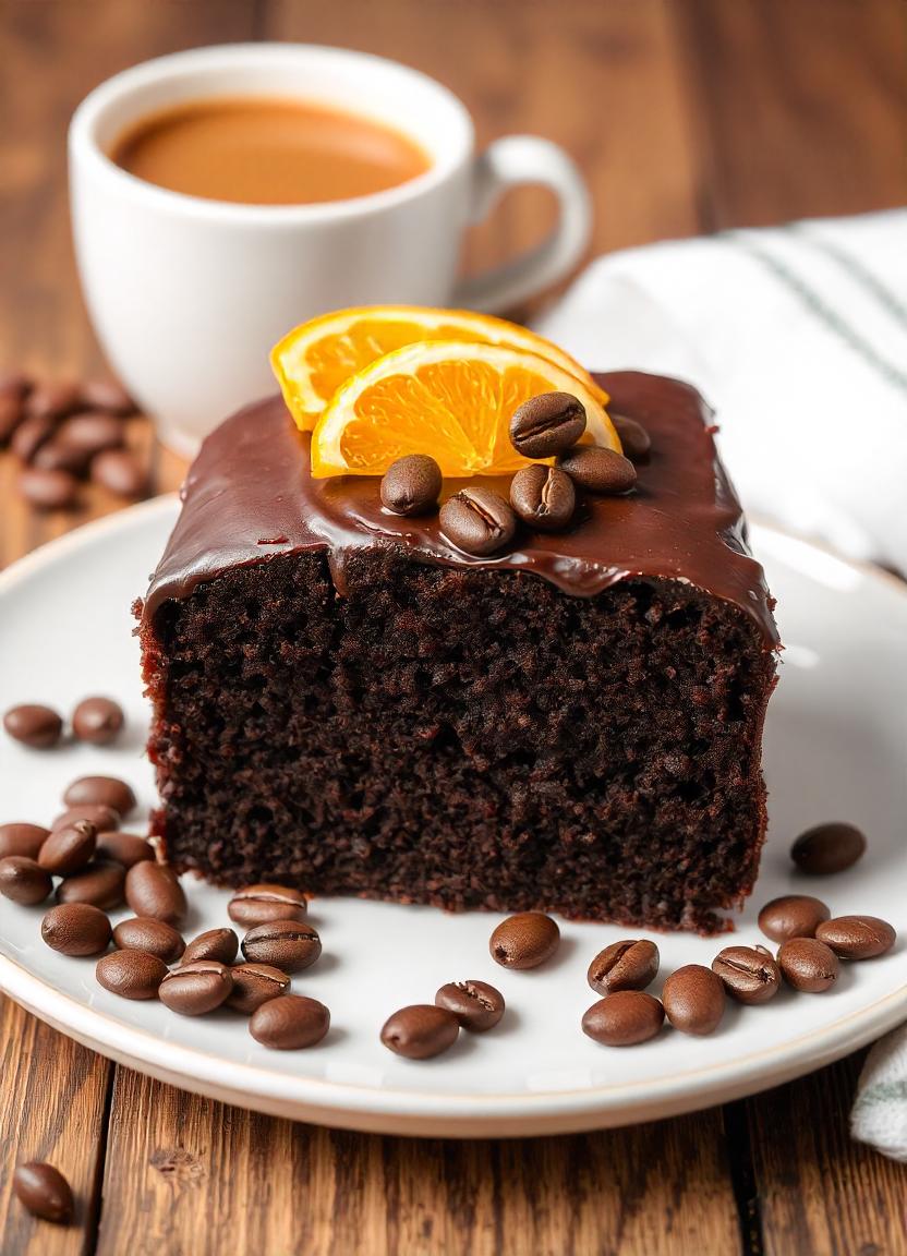 baking, bean, beans, cake, chocolate, coffee, cup, dessert, food, frosting, glaze, orange, pastry, plate, slice, sweet, treat, white, wooden, zest
