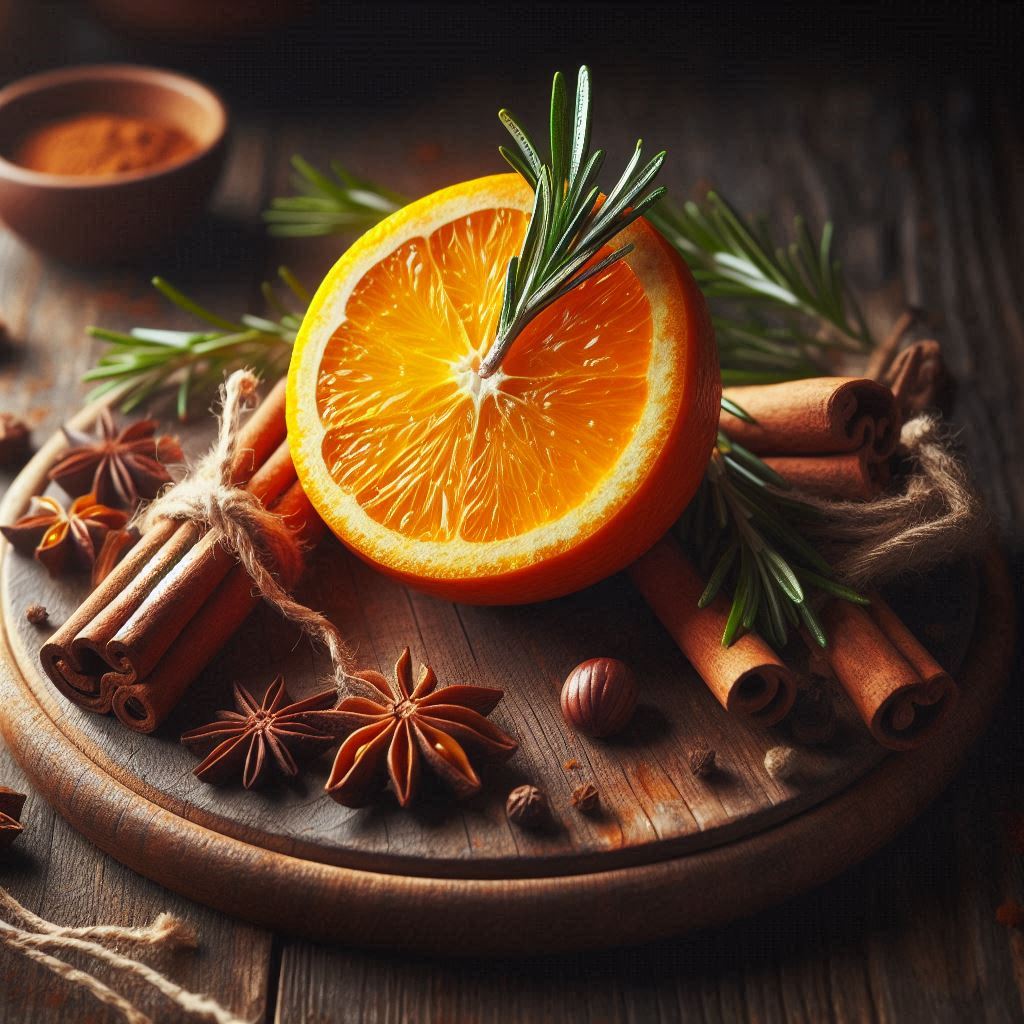 A halved orange with rosemary resting on a wooden cutting board surrounded by cinnamon sticks and star anise.
