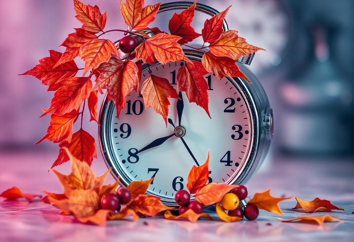 A silver alarm clock with black hands and white face is surrounded by red and orange autumn leaves. The leaves are scattered on a pink surface.