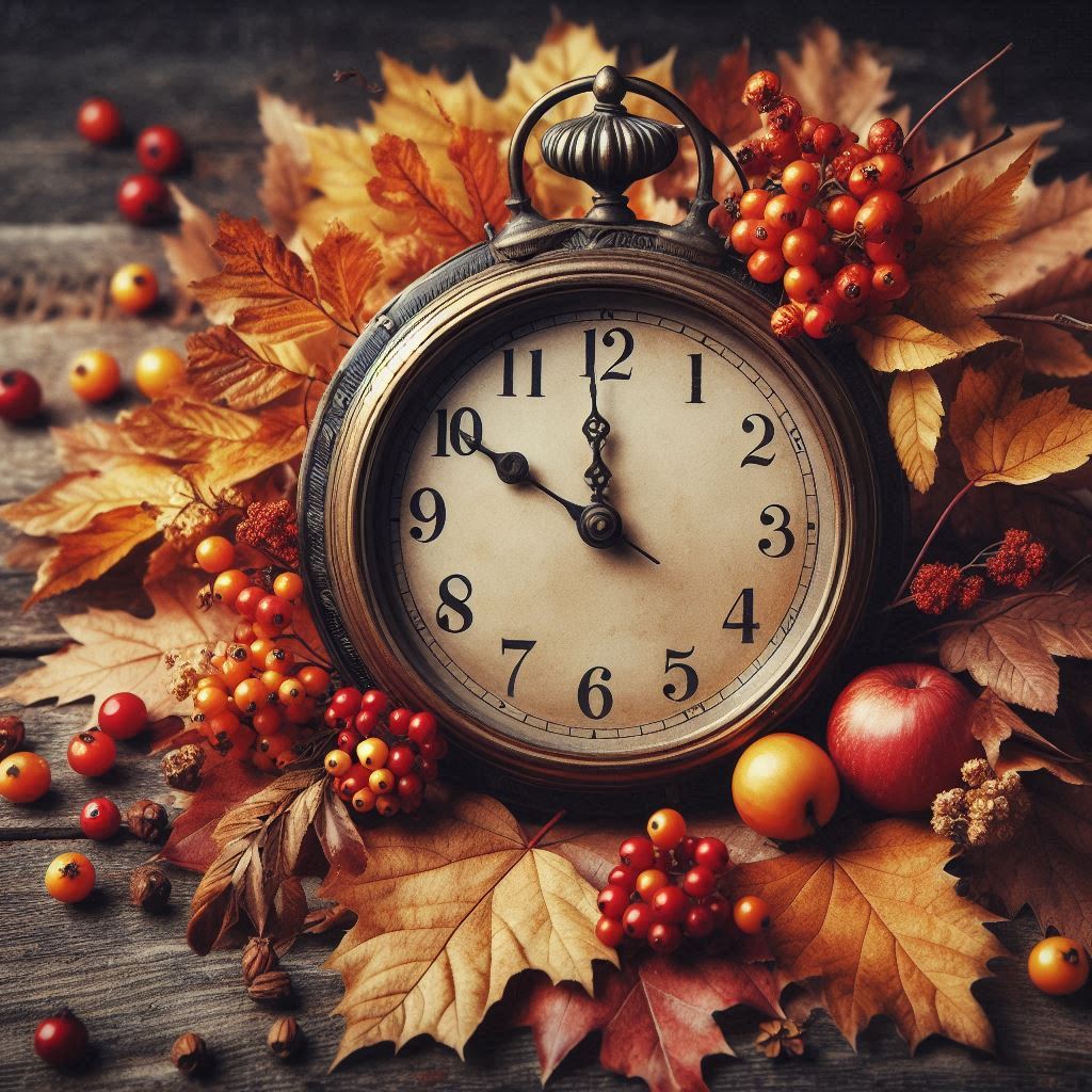 An old-fashioned pocket watch with Roman numeral markings lies on a wooden surface, surrounded by autumn leaves and berries.