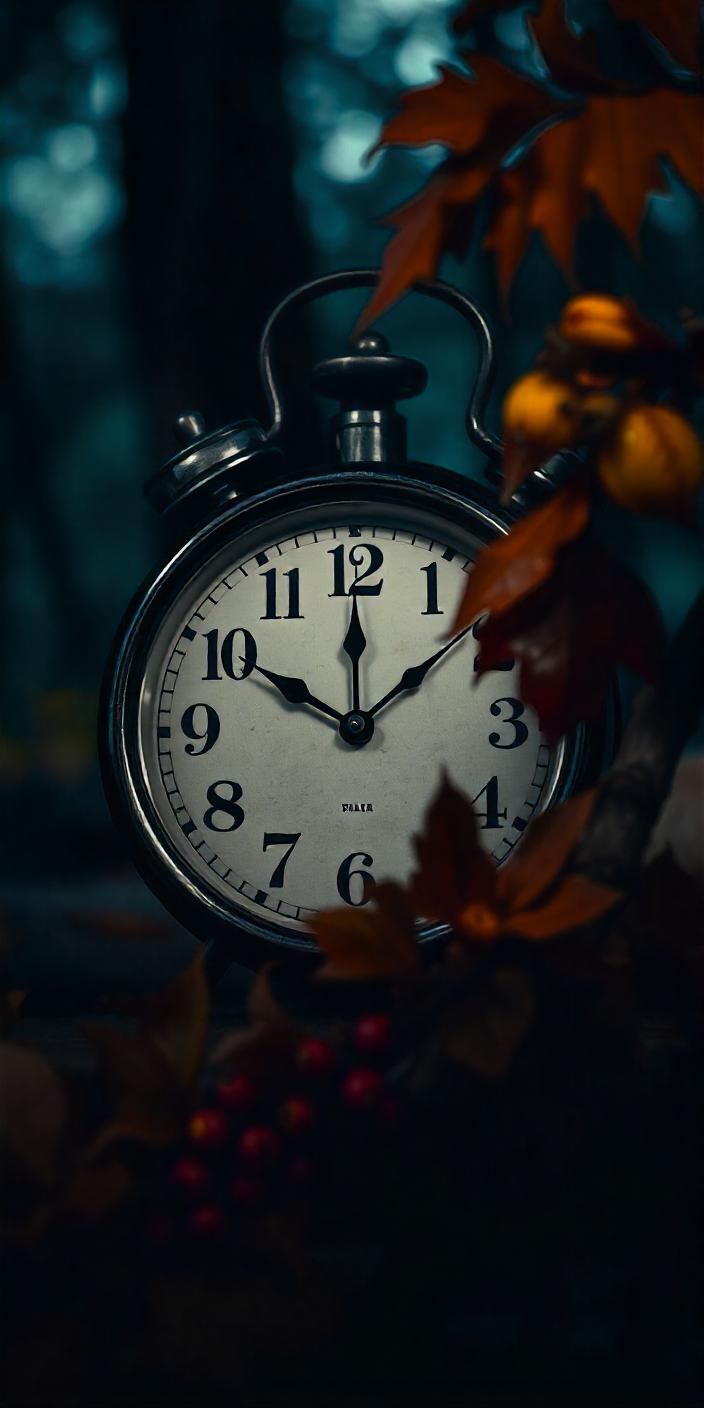 alarm, autumn, background, blur, blurry, change, clock, fall, forest, green, hands, leaves, nature, orange, red, roman, season, time, vintage, woods