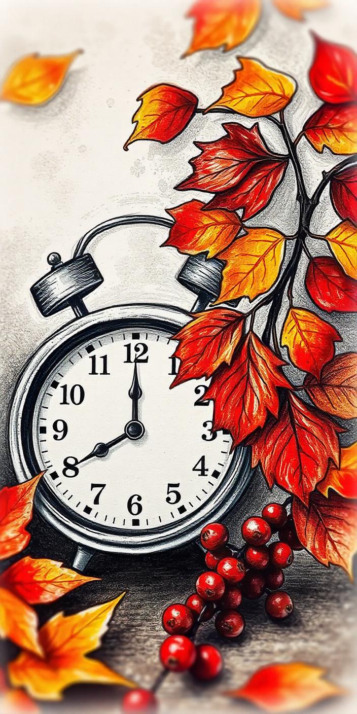 alarm, art, autumn, berries, clock, december, drawing, fall, illustration, leaves, life, nature, november, october, pencil, red, seasonal, still, time, yellow