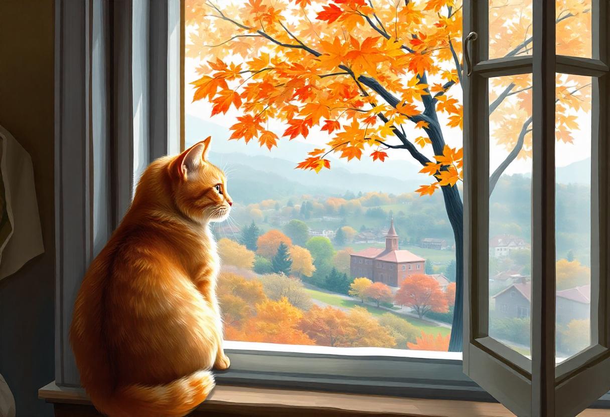 Ginger cat by the window, gazing at autumn