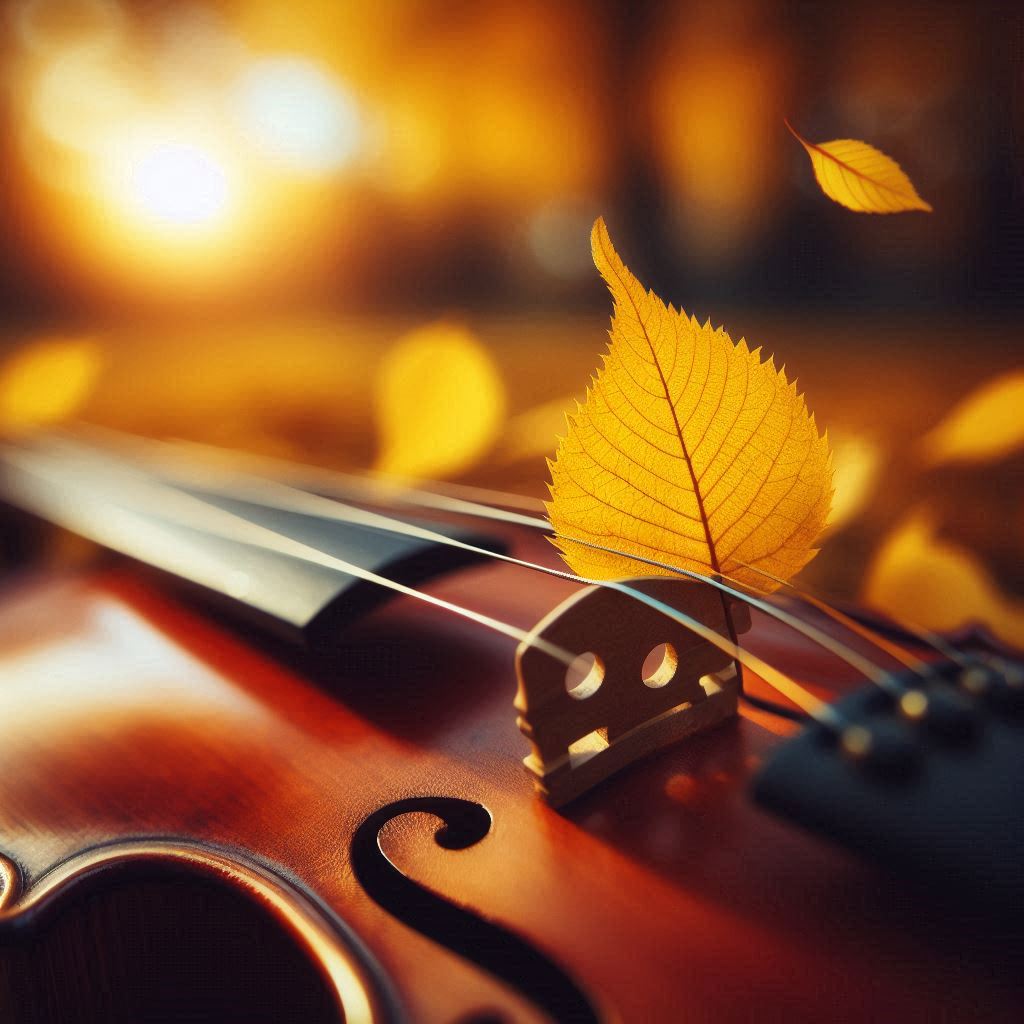 A single golden leaf rests on the strings of a violin. Other leaves are scattered around, and the background is blurred with a warm, autumnal glow.