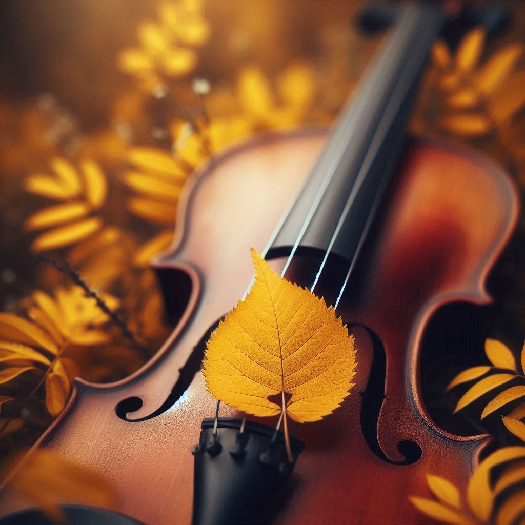 A violin lies on a bed of yellow autumn leaves. A single, bright yellow leaf is resting on the strings of the violin.