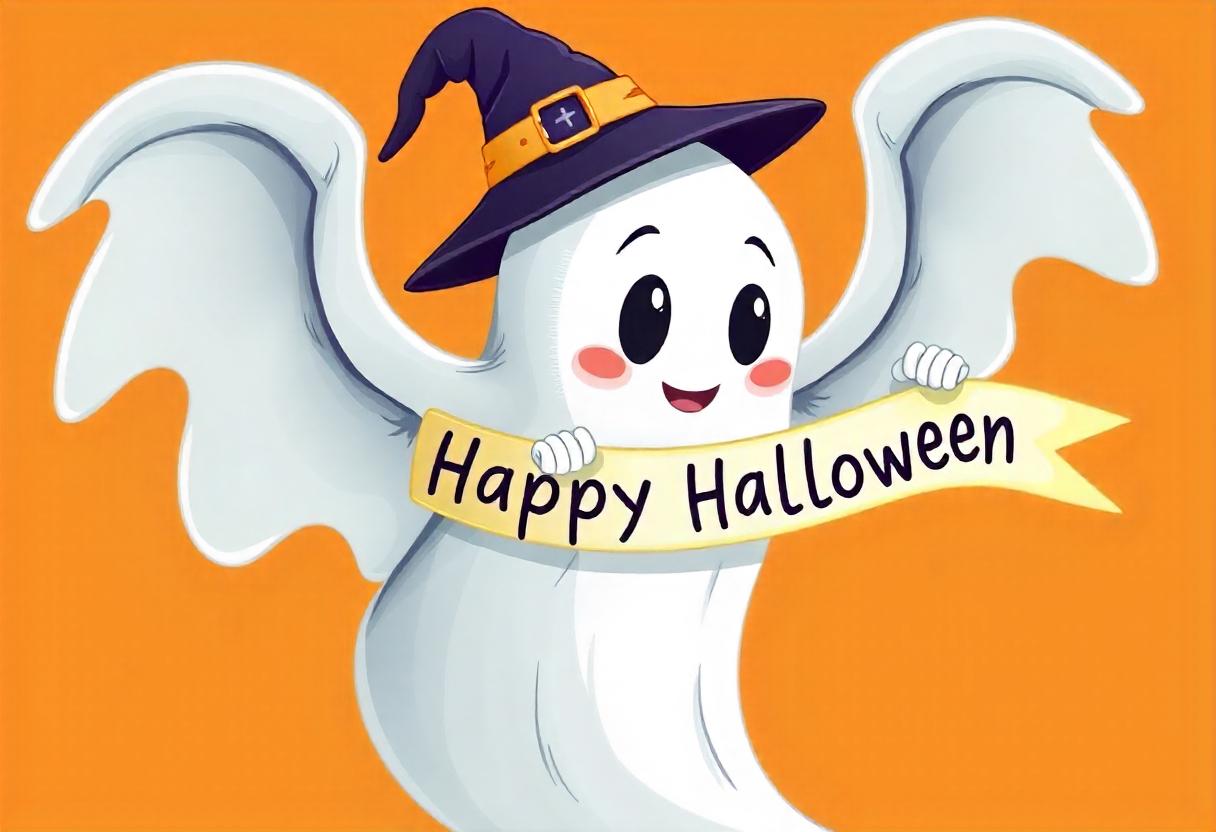 A cartoon ghost wearing a witch's hat with a black brim and a gold buckle smiles and holds a yellow banner that reads Happy Halloween.