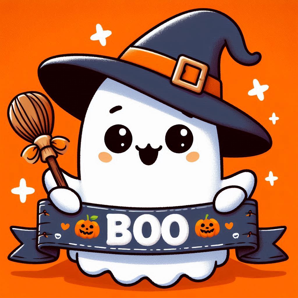 A cartoon ghost with big eyes and a smile wears a witch hat and holds a broom. The ghost is surrounded by stars and a banner that reads BOO.