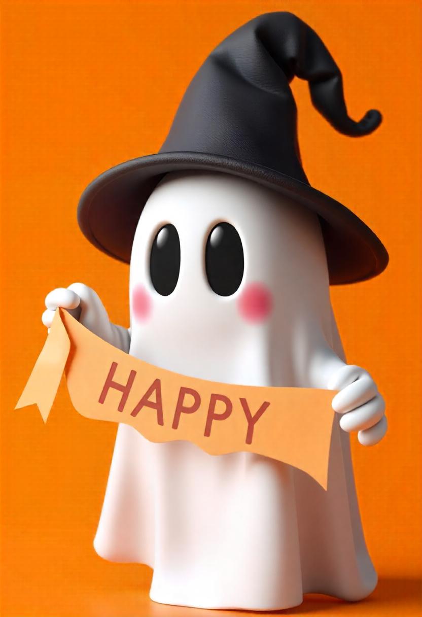A white ghost with rosy cheeks and large eyes is wearing a black witch hat. It is holding a banner that reads Happy with a bright orange background.