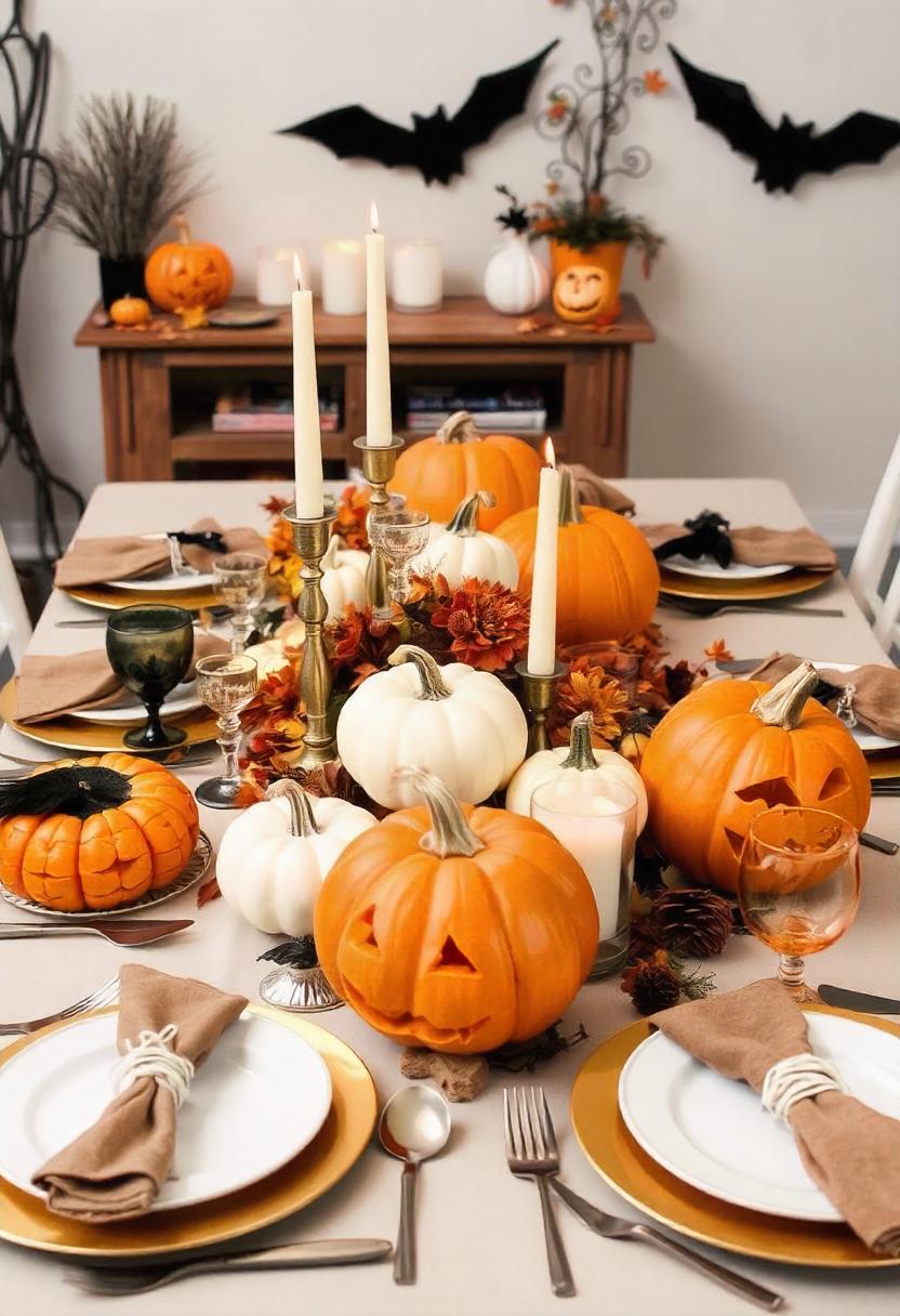 A table is set for a Halloween dinner with a centerpiece of carved pumpkins and white pumpkins