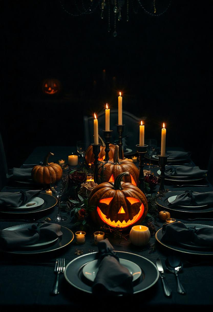 black, candelabras, candle, carved, dark, decoration, dinner, festive, halloween, holiday, lit, napkins, october, party, plates, pumpkins, setting, silverware, spooky, table