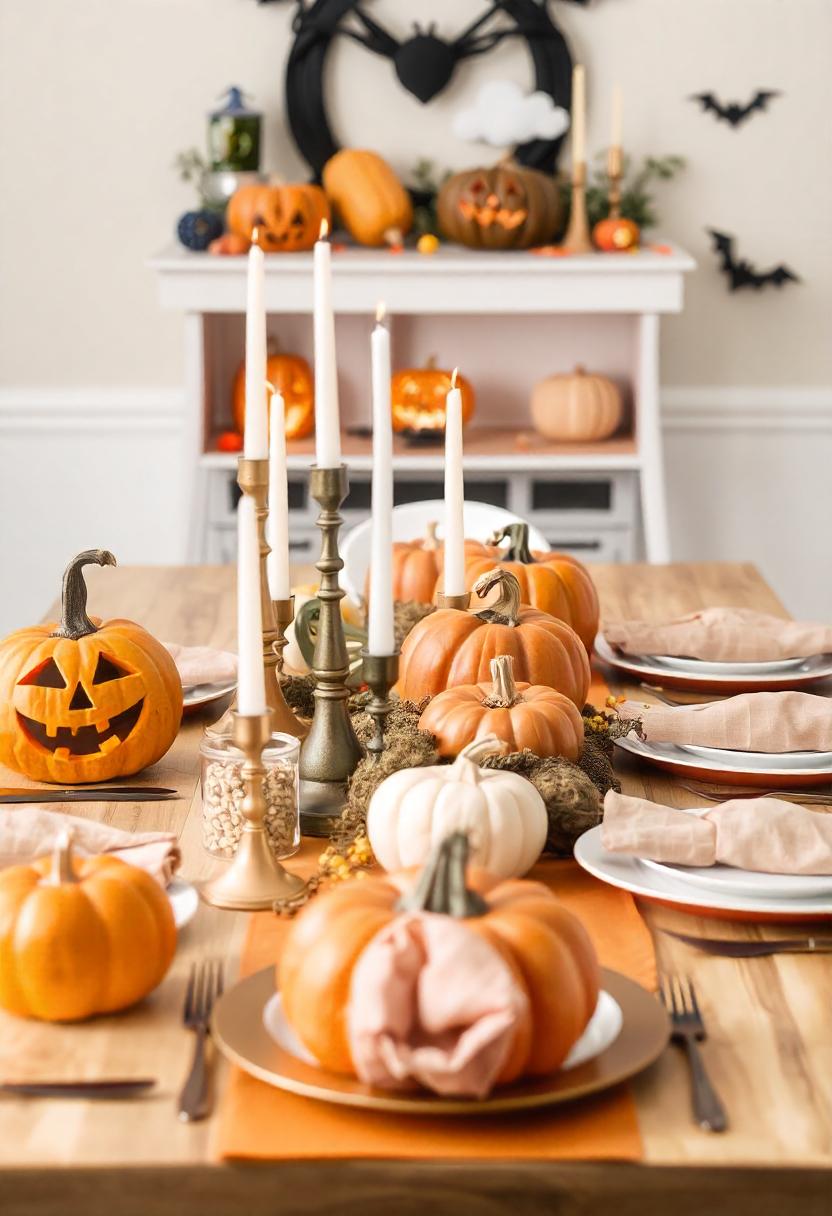 autumn, candles, centerpiece, charger, decor, decoration, dinner, fall, festive, gold, halloween, orange, party, place, pumpkins, runner, setting, table, white, wooden