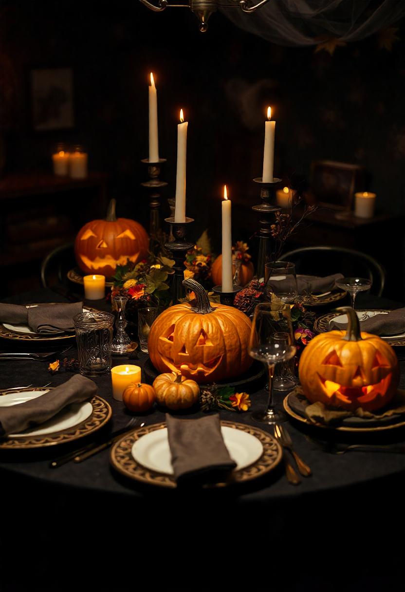 A dimly lit dining table is set for a Halloween dinner