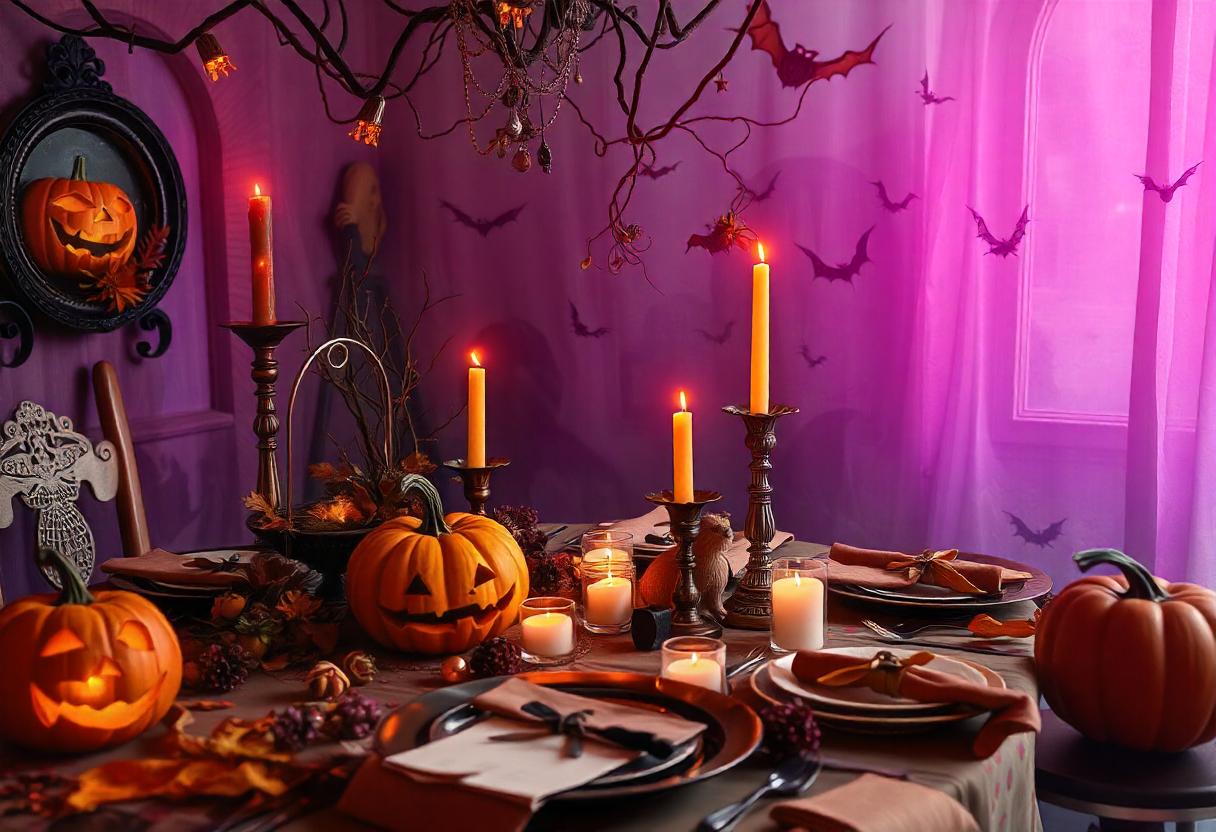 A Halloween-themed dinner table set with lit candles, pumpkins, and fall decor. Bats decorate the purple wall.
