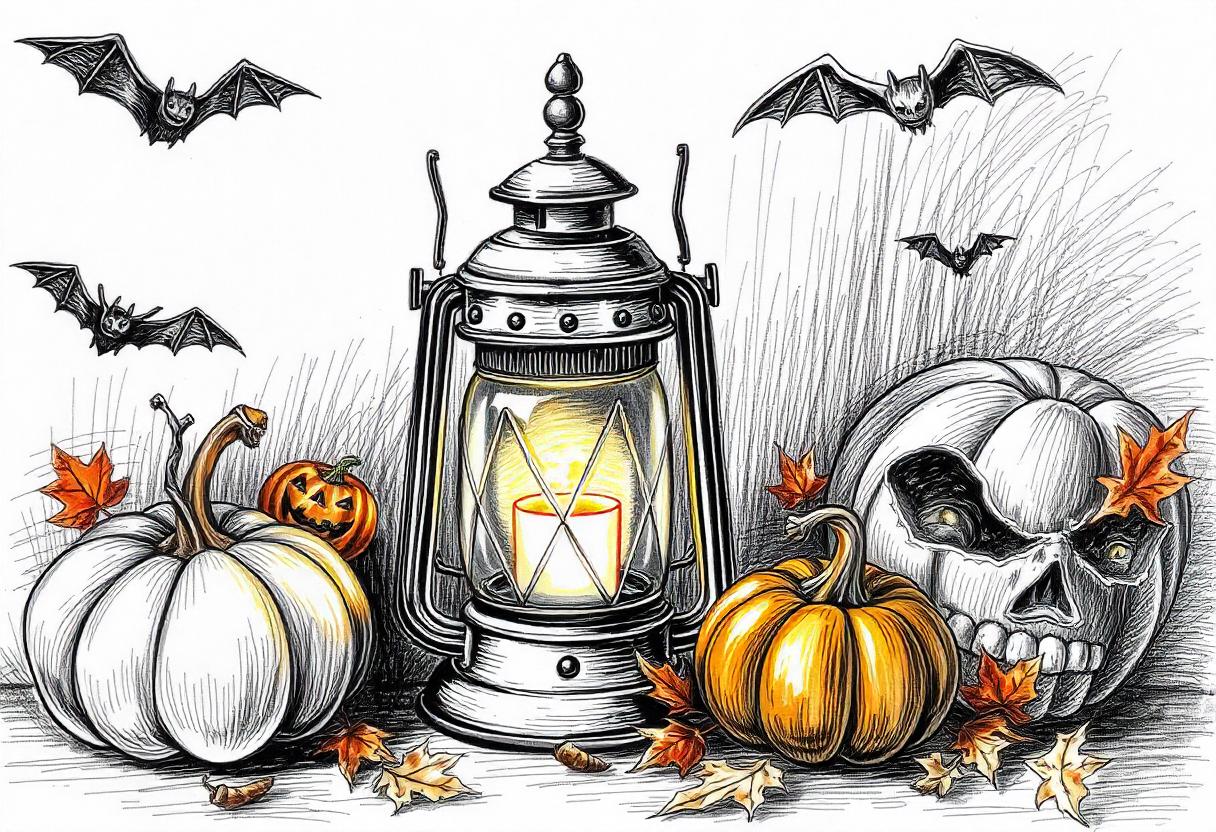 A drawing of a lantern with a lit candle inside, surrounded by pumpkins and bats.
