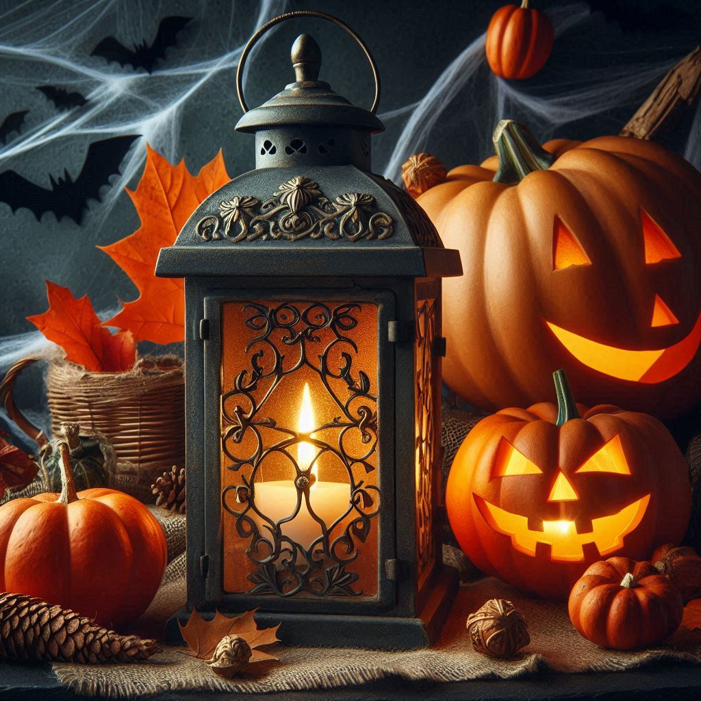 A lit lantern sits beside carved pumpkins on halloween night