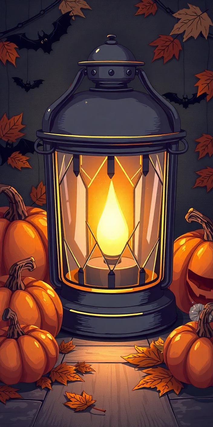 A glowing lantern sits among pumpkins and autumn leaves on a wooden table. The lantern is lit with a warm, yellow flame.
