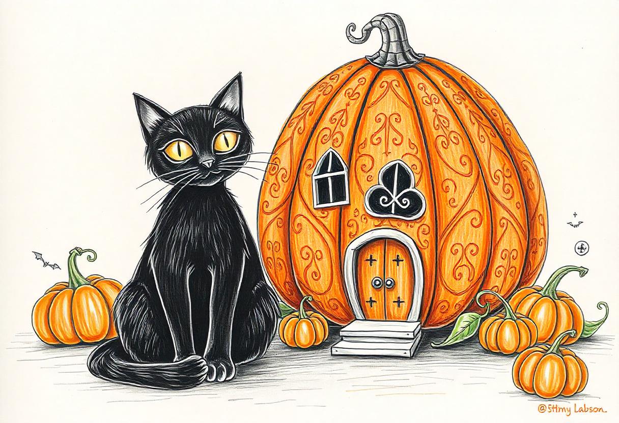 art, black, cat, cute, door, drawing, festive, front, halloween, holiday, house, illustration, october, orange, pumpkin, sitting, small, spooky, whimsical, window