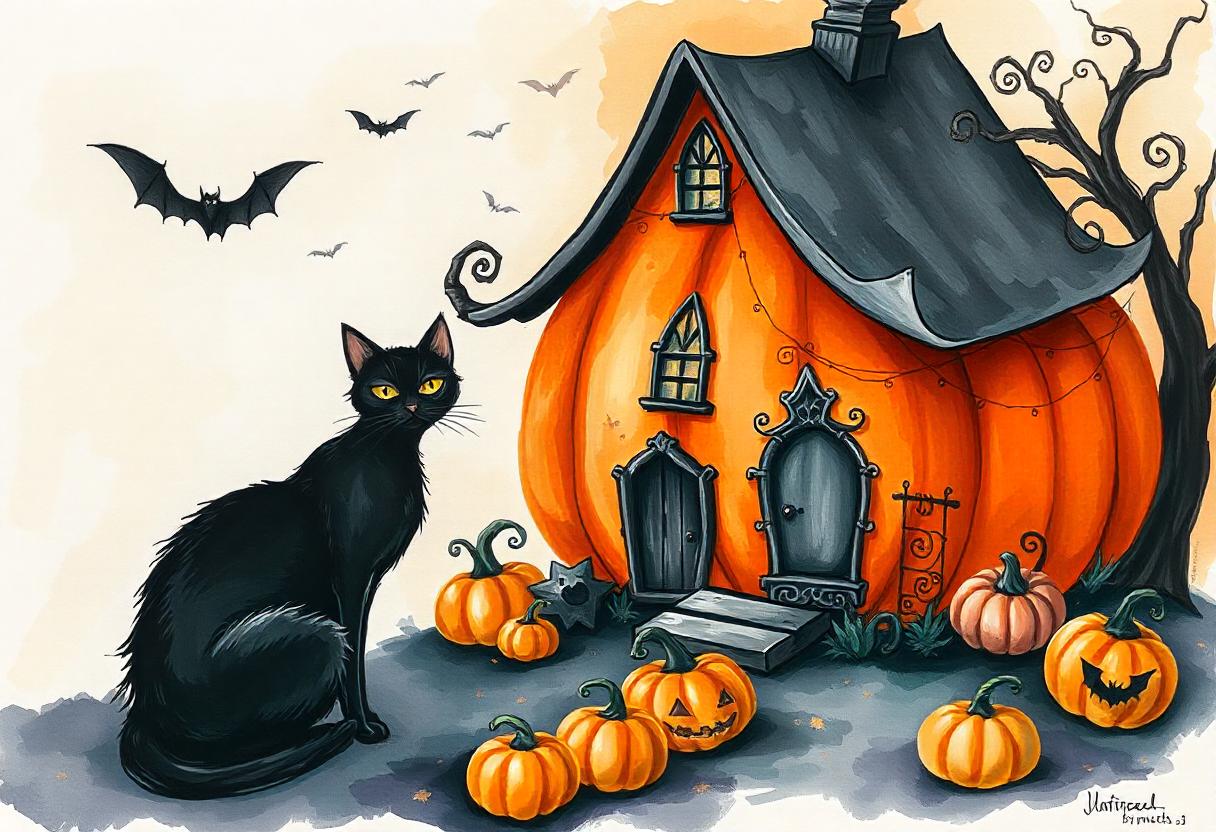 art, autumn, bats, black, carved, cat, cute, decoration, digital, fall, halloween, holiday, house, illustration, october, orange, painting, pumpkin, season, spooky