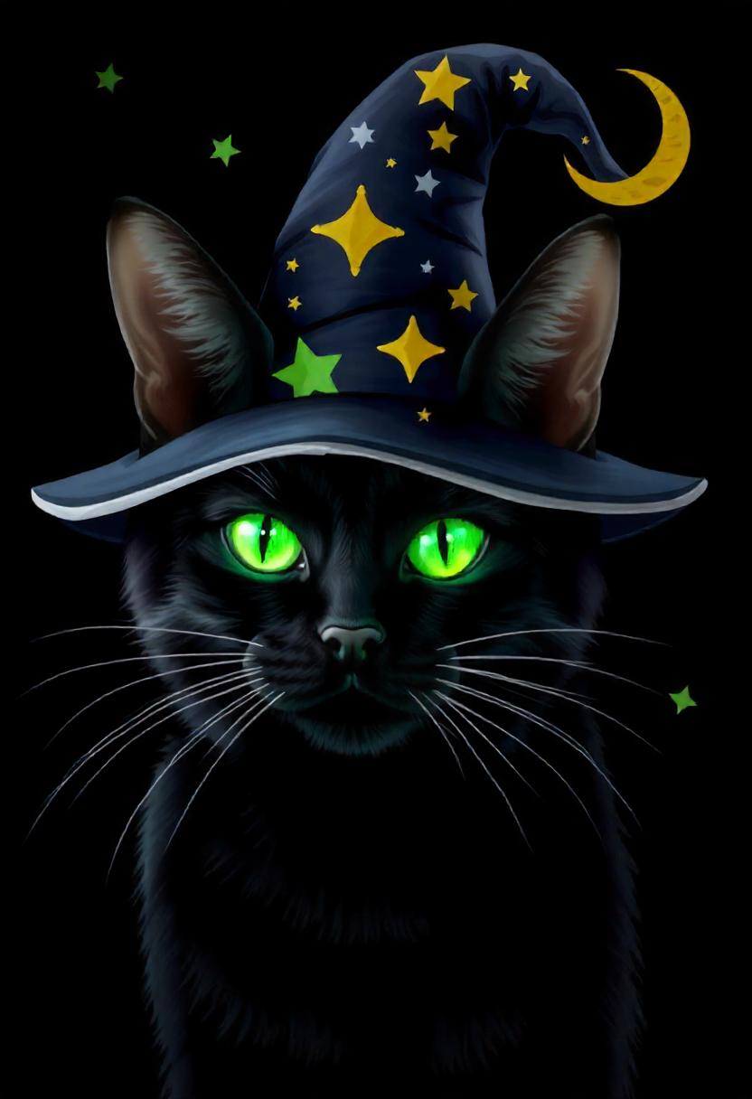 black, cat, crescent, dark, eyes, feline, green, halloween, hat, magic, magical, moon, mysterious, night, sorcery, spell, spooky, stars, witch, wizard