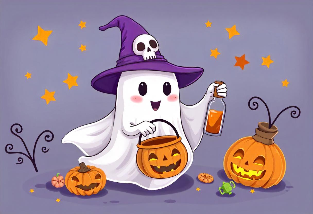 A ghost wearing a witch's hat holds a pumpkin bucket and a bottle of potion while trick-or-treating on Halloween.