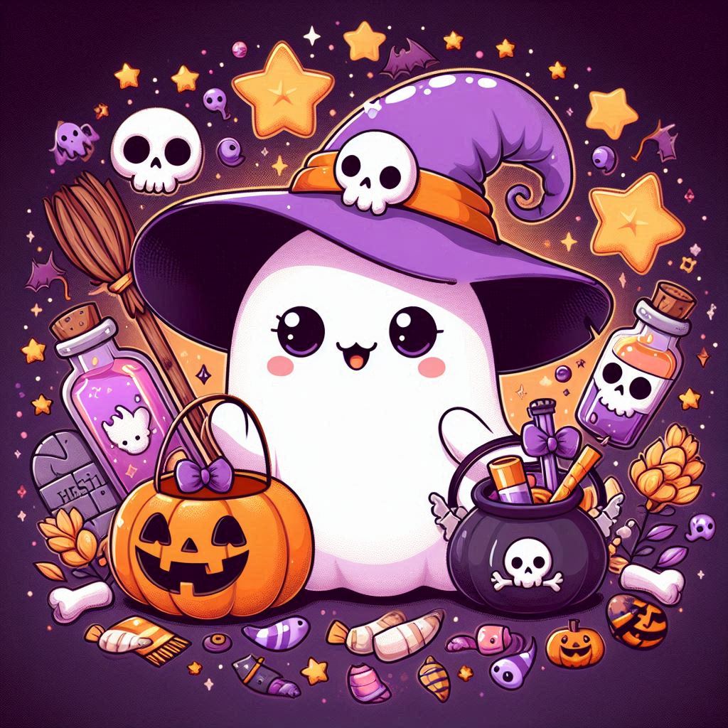 A friendly-looking ghost wearing a purple witch hat holds a small jack-o'-lantern in its hand