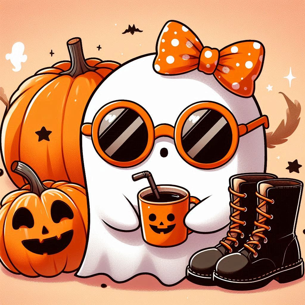 A white ghost with a red bow, sunglasses, and a straw in its mouth holds a pumpkin-shaped mug of coffee