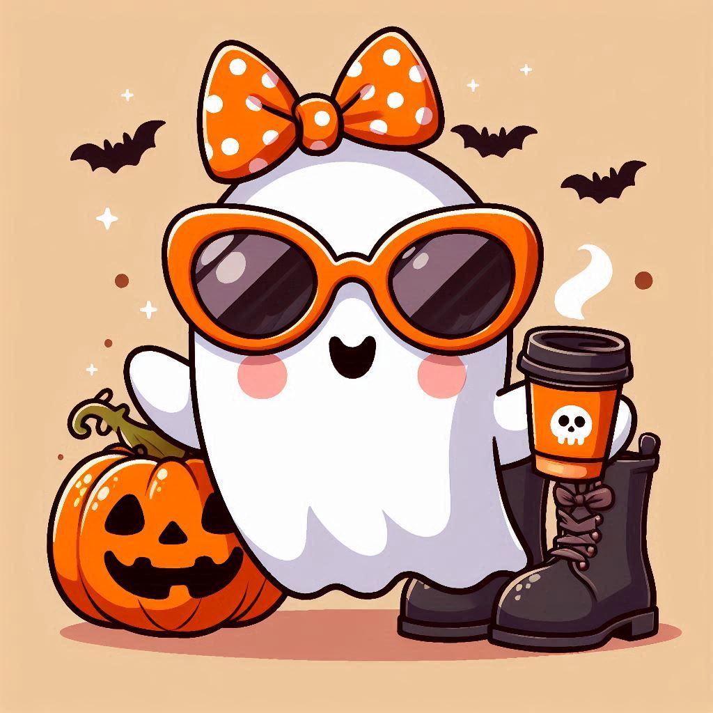 A cartoon ghost, wearing orange sunglasses and a polka dot bow, holds a cup of coffee with a skull design