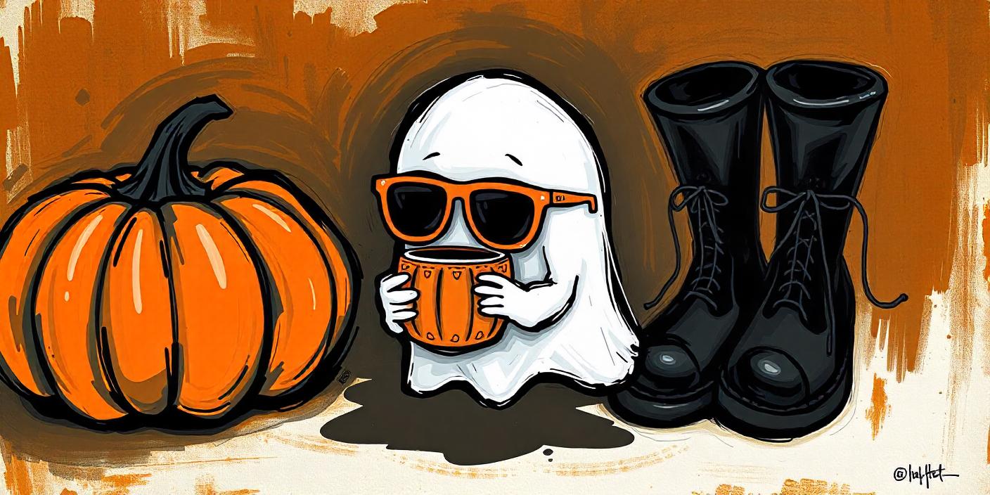 A ghost wearing sunglasses holds a pumpkin spice drink in front of a large pumpkin. A pair of black boots are in the background.
