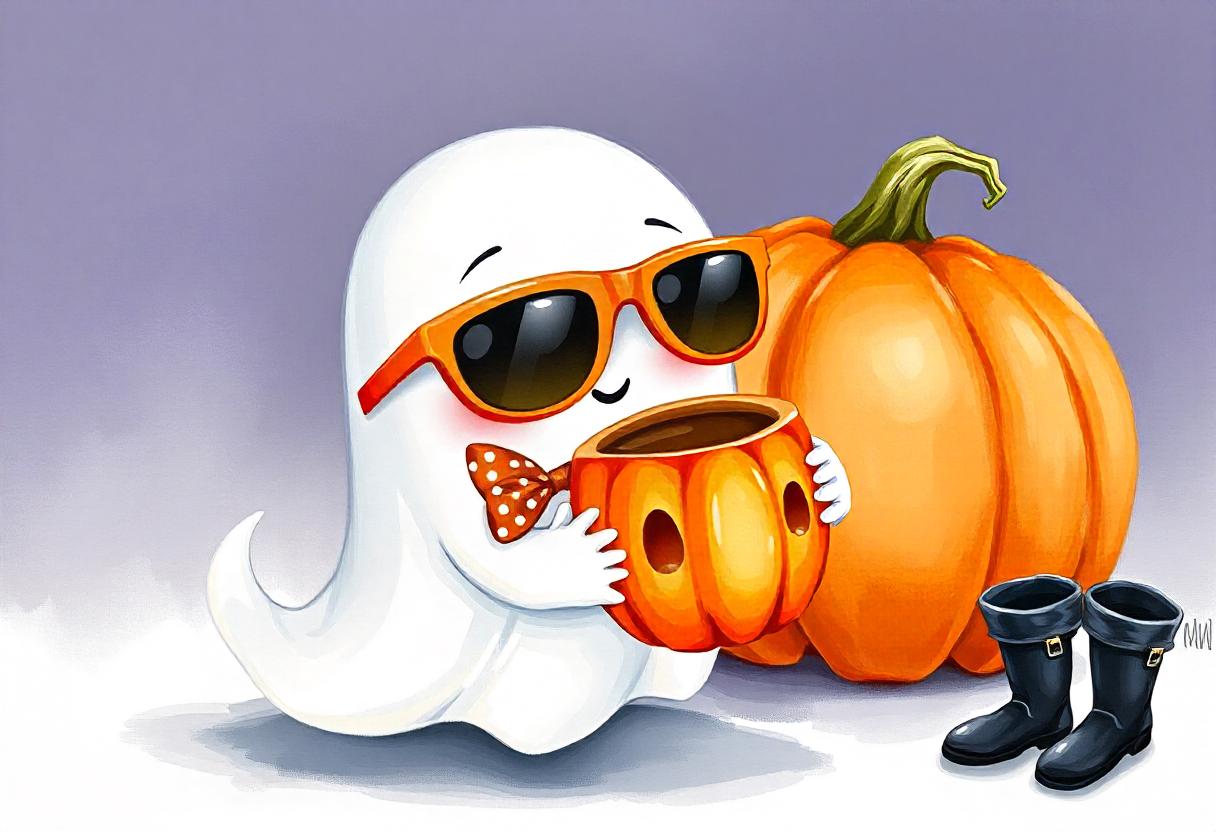 A cartoon ghost with sunglasses and a polka-dot bowtie is holding a pumpkin carved into a cup