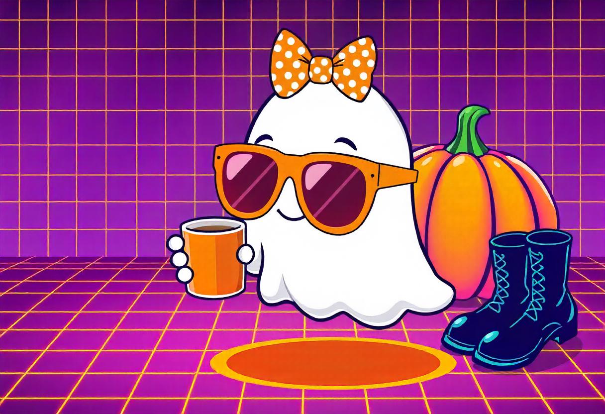 art, boots, bow, cartoon, checkered, coffee, cup, cute, digital, floor, funny, ghost, halloween, illustration, orange, pumpkin, purple, retro, sunglasses, whimsical