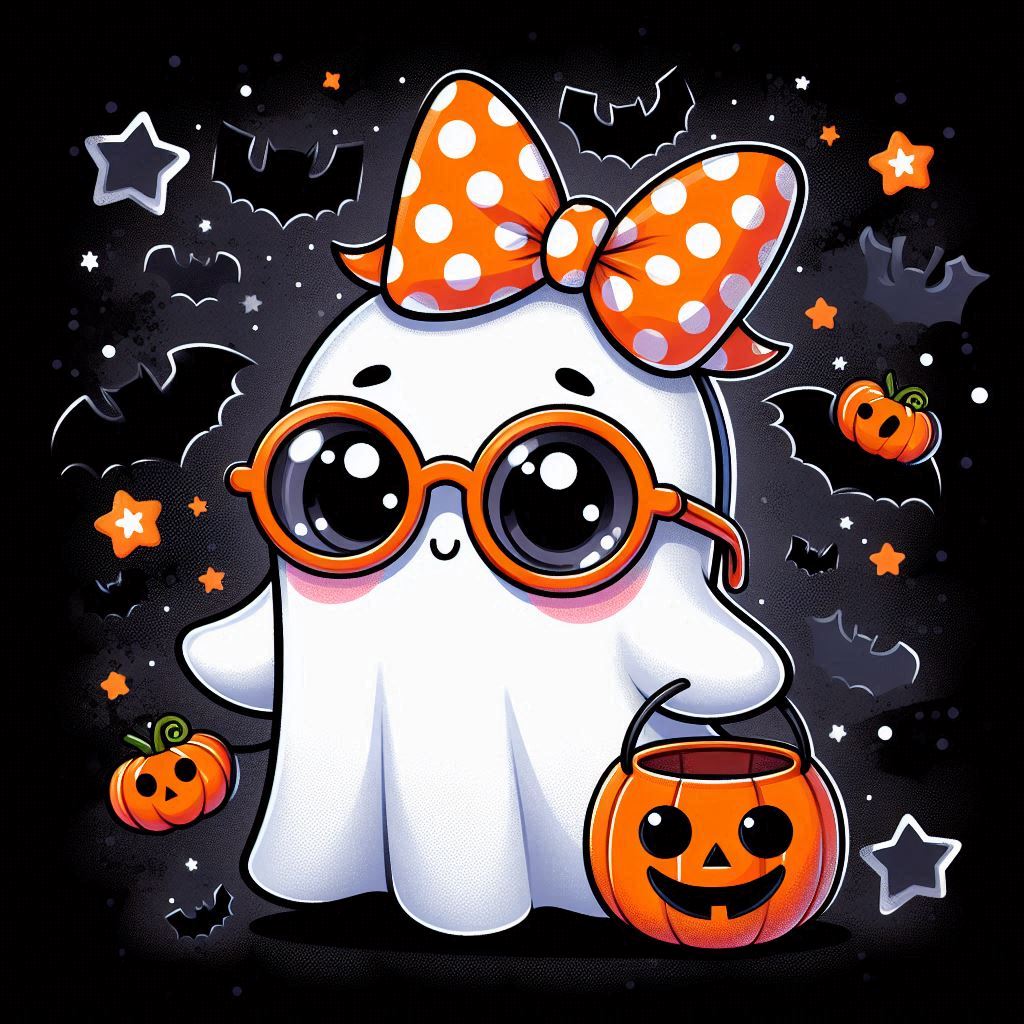 A cartoon ghost with large eyes is wearing sunglasses and a polka-dotted bow