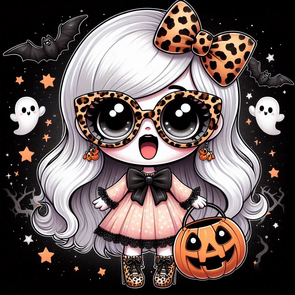 A cartoon girl with long white hair, wearing a pink dress and leopard-print sunglasses, is holding a jack-o'-lantern bucket while trick-or-treating.