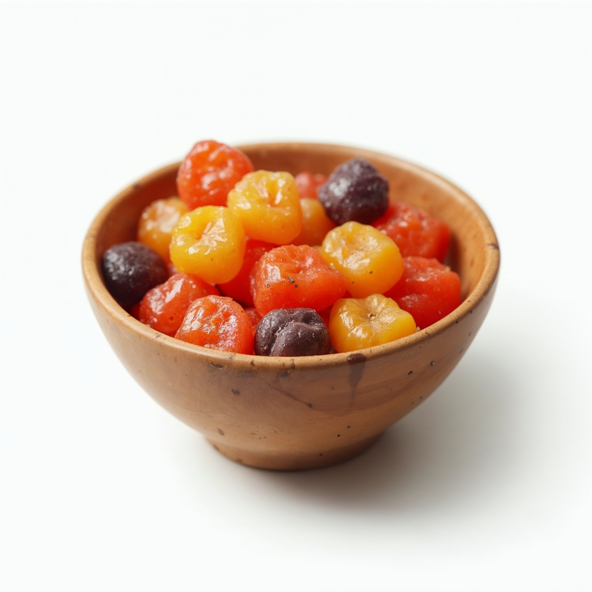 A brown bowl filled with colorful candied fruits. The fruits are mostly orange and red, with a few dark brown ones mixed in