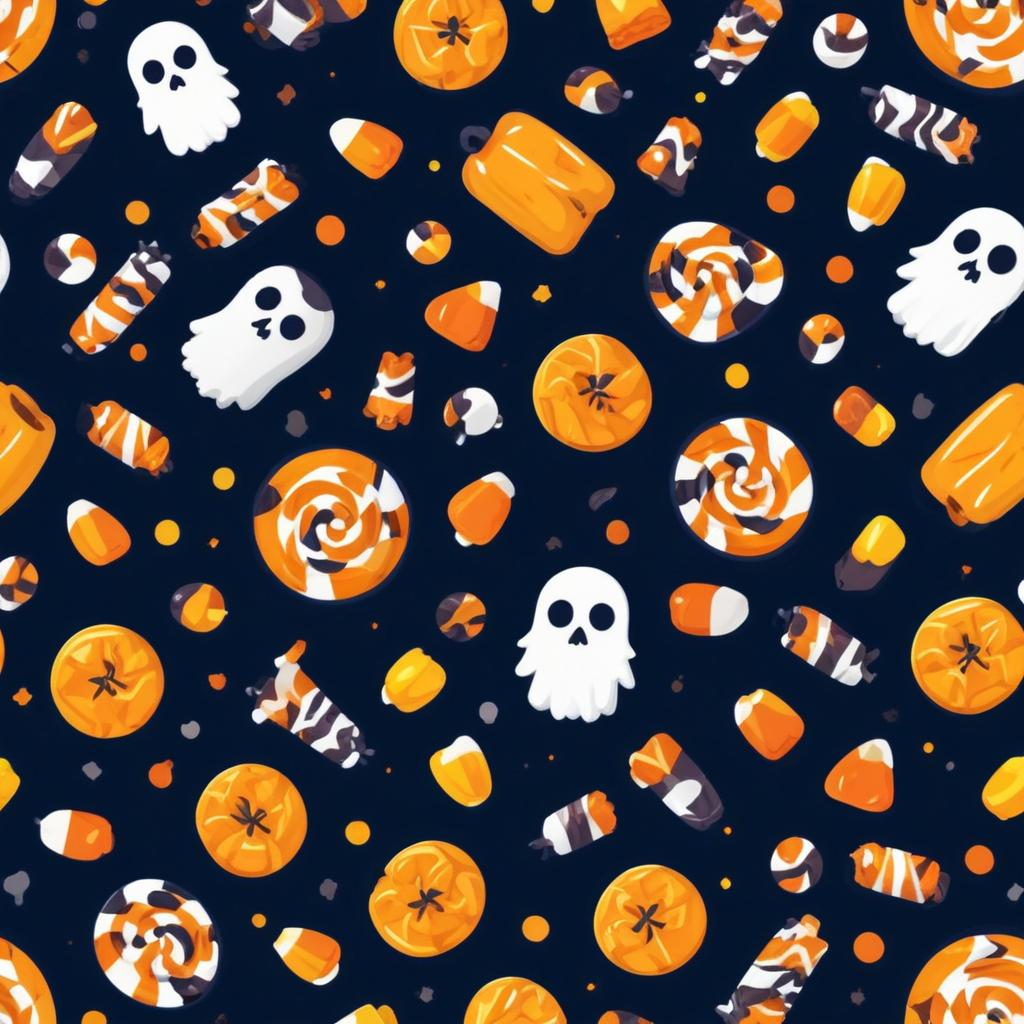 A dark blue background with white ghosts, orange pumpkins, yellow candy corn, and orange and white striped lollipops.