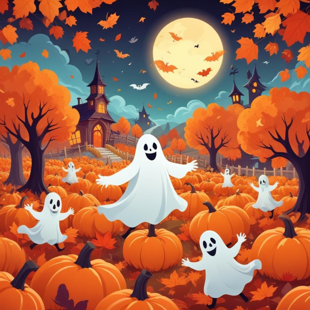 A group of friendly ghosts are dancing in a pumpkin patch. A full moon hangs in the sky with bats flying around. The ground is covered in fall leaves.