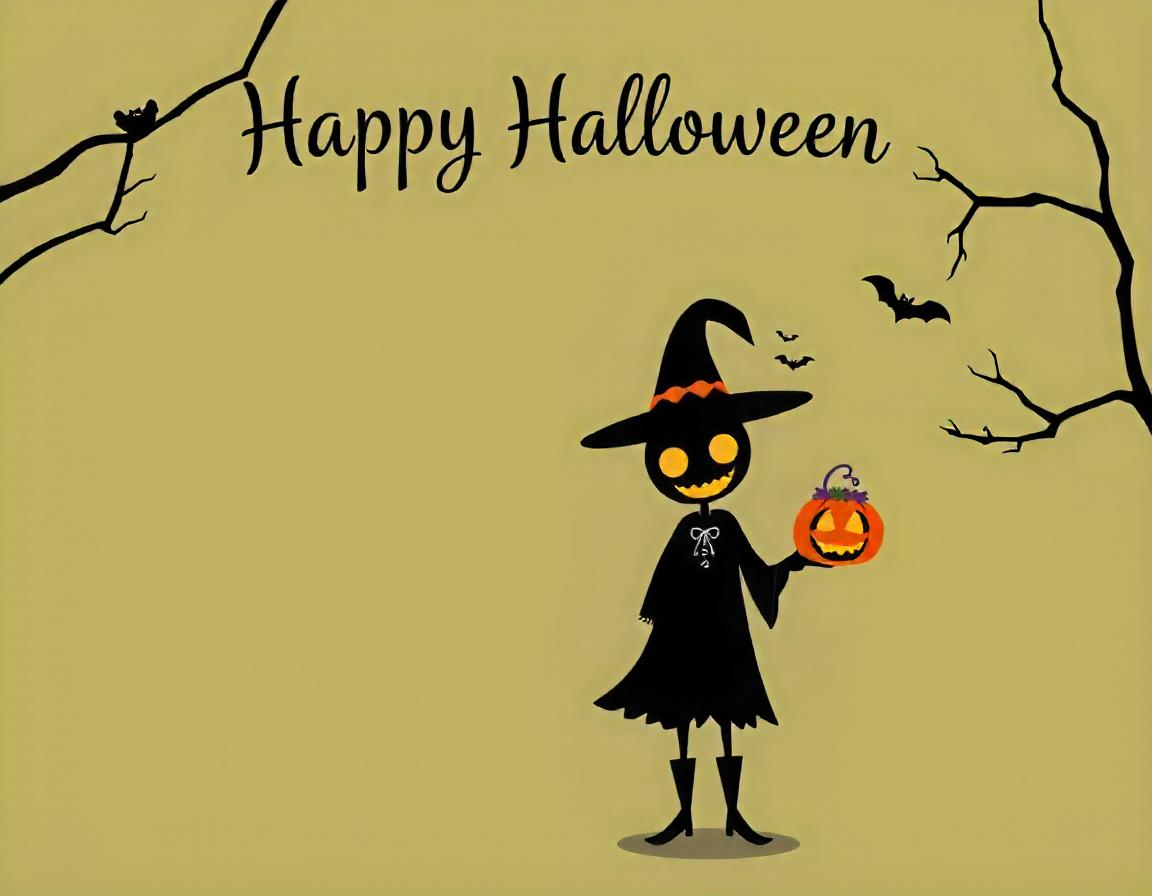 A witch silhouette in a pointed hat with a jack-o'-lantern stands against a green background with bats and bare branches.