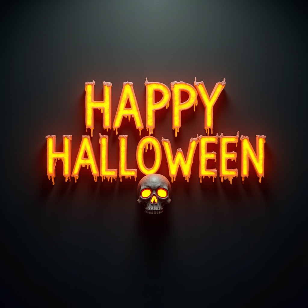 A glowing orange Happy Halloween message with dripping letters and a skull underneath it on a dark background.