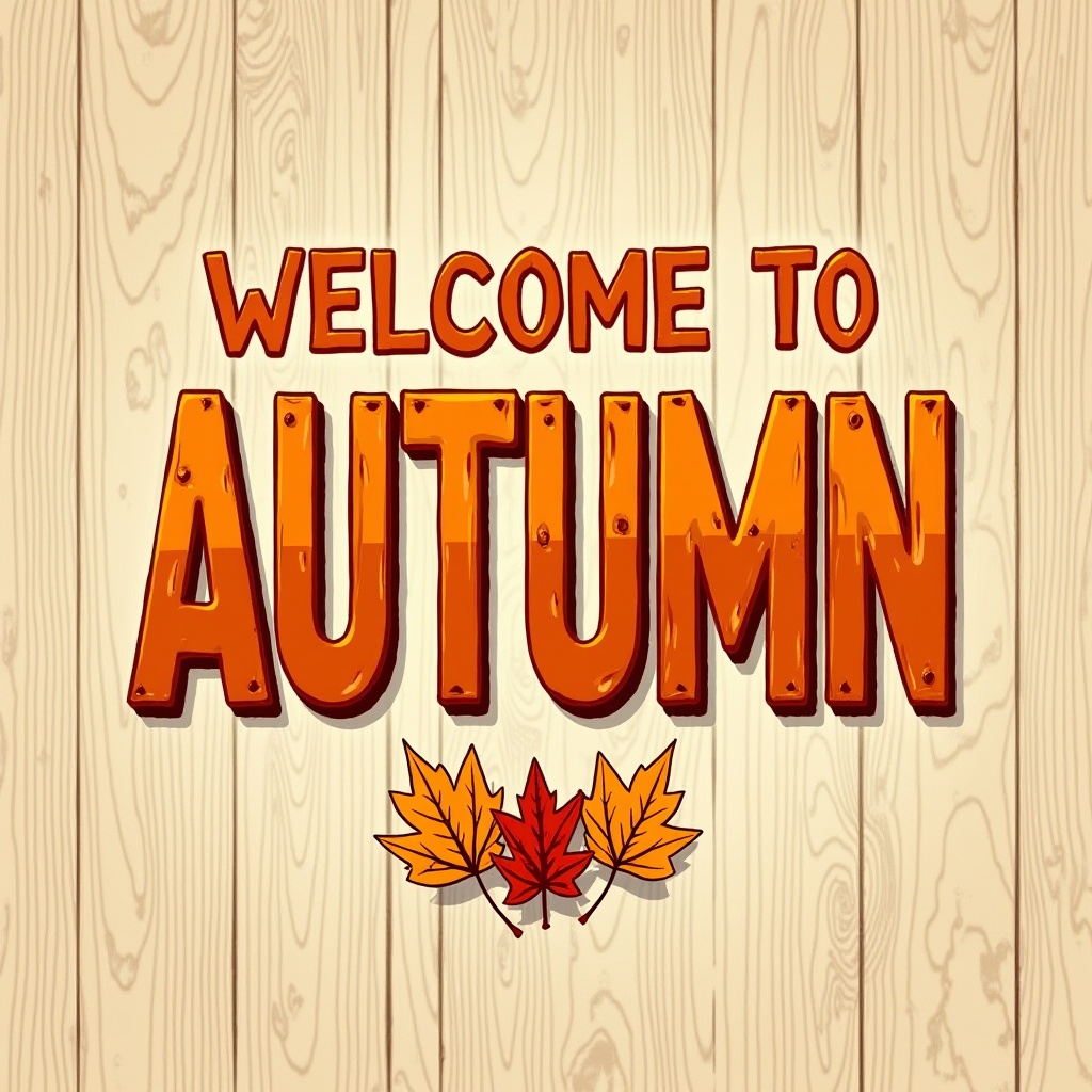 A graphic design featuring the words Welcome to Autumn in orange letters with a woodgrain texture. Three stylized fall leaves are displayed below.