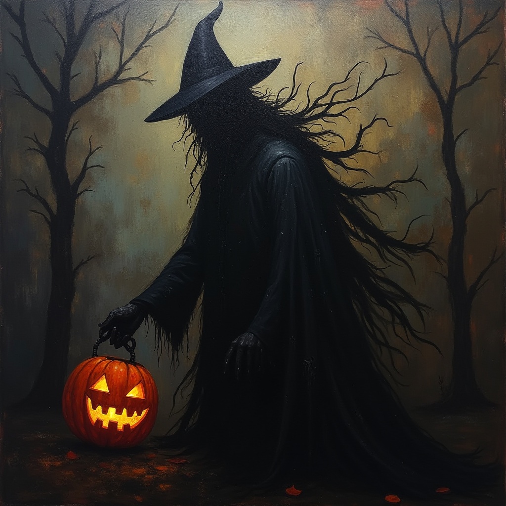 A shadowy figure wearing a pointed hat and long black robes walks through a dark forest. The figure is holding a lit jack-o'-lantern in one hand