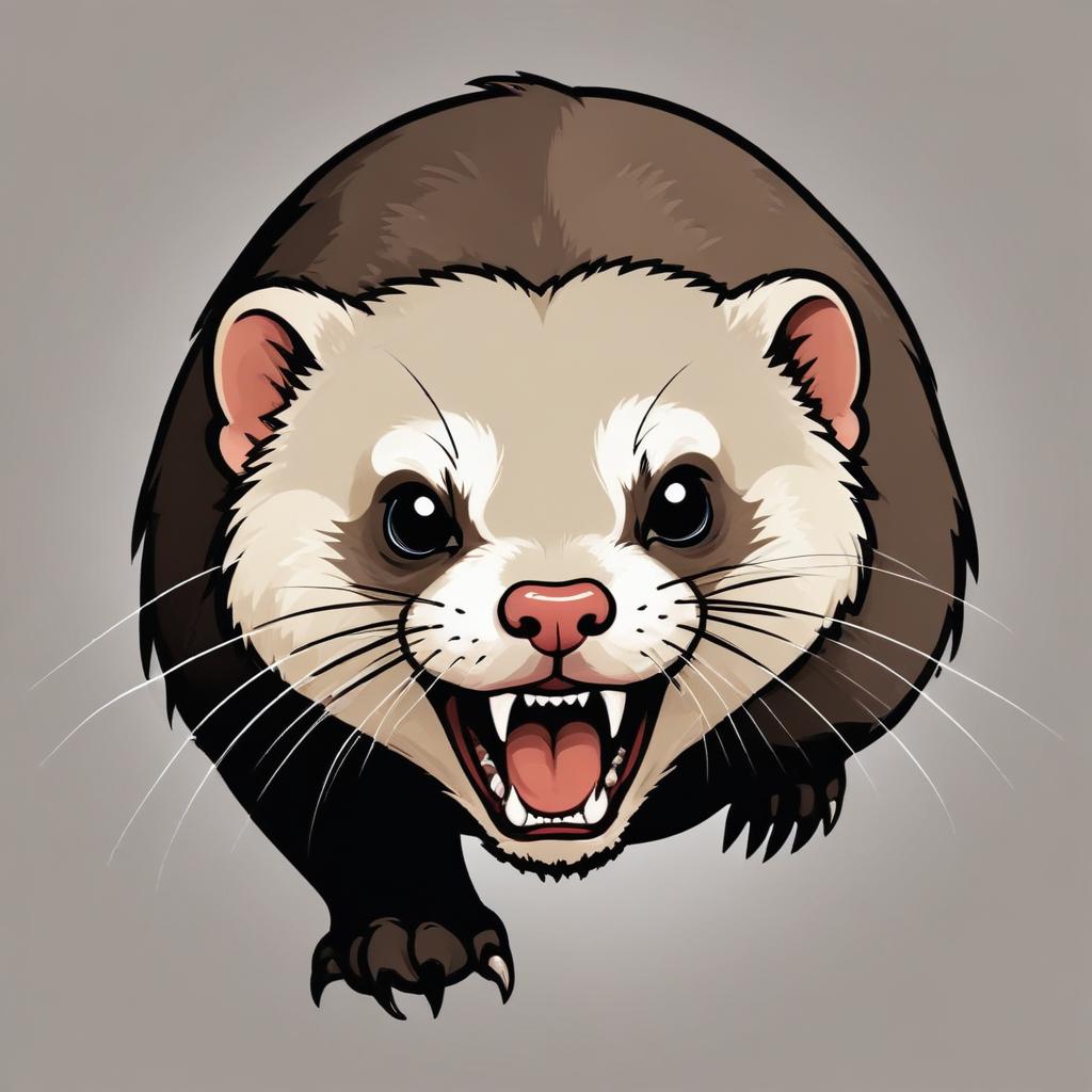 A cartoon ferret with brown fur and a white face stares at the viewer with a wide grin, showing its sharp teeth.