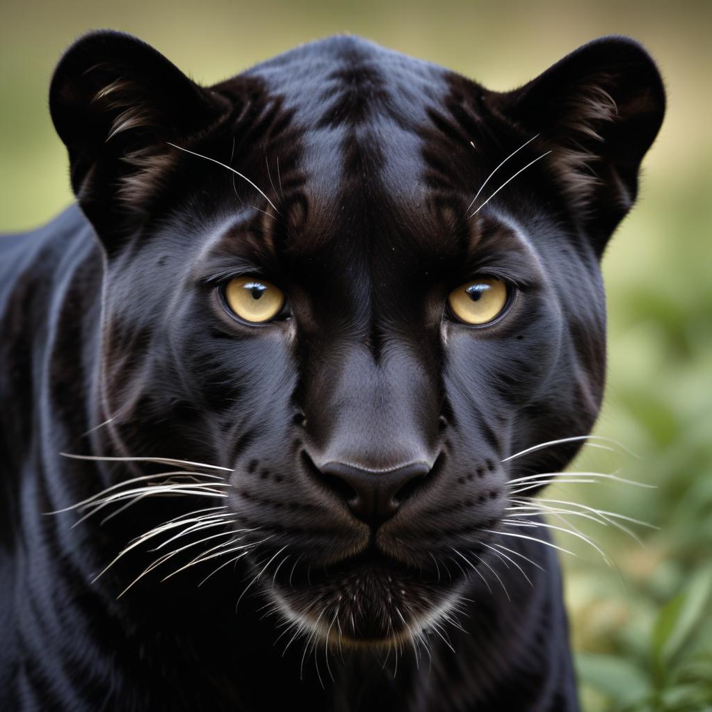 A close-up shot of a black panther with bright green eyes, looking directly at the viewer.